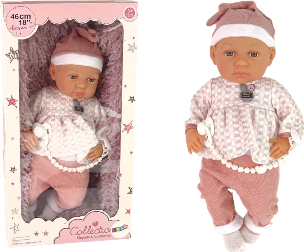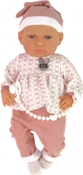 Ta realistyczna lalka wielkością i wykonaniem przypomina prawdziwe niemowlę. Ma miękkie materiałowe ciałko, a główkę, rączki i nóżki z przyjemnego w dotyku materiału dla komfortowej zabawy. Ubrana jest w biało-niebieski komplet: niebieski sweterek, czapeczkę i skarpetki z białymi spodniami – wszystko idealnie do siebie pasuje.
