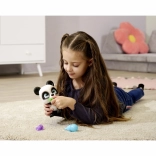Panda pije wodę z dołączonej butelki, a następnie sika w pieluszkę, która zmienia kolor na żółty, gdy jest wilgotna, dla autentycznego doświadczenia zabawy.