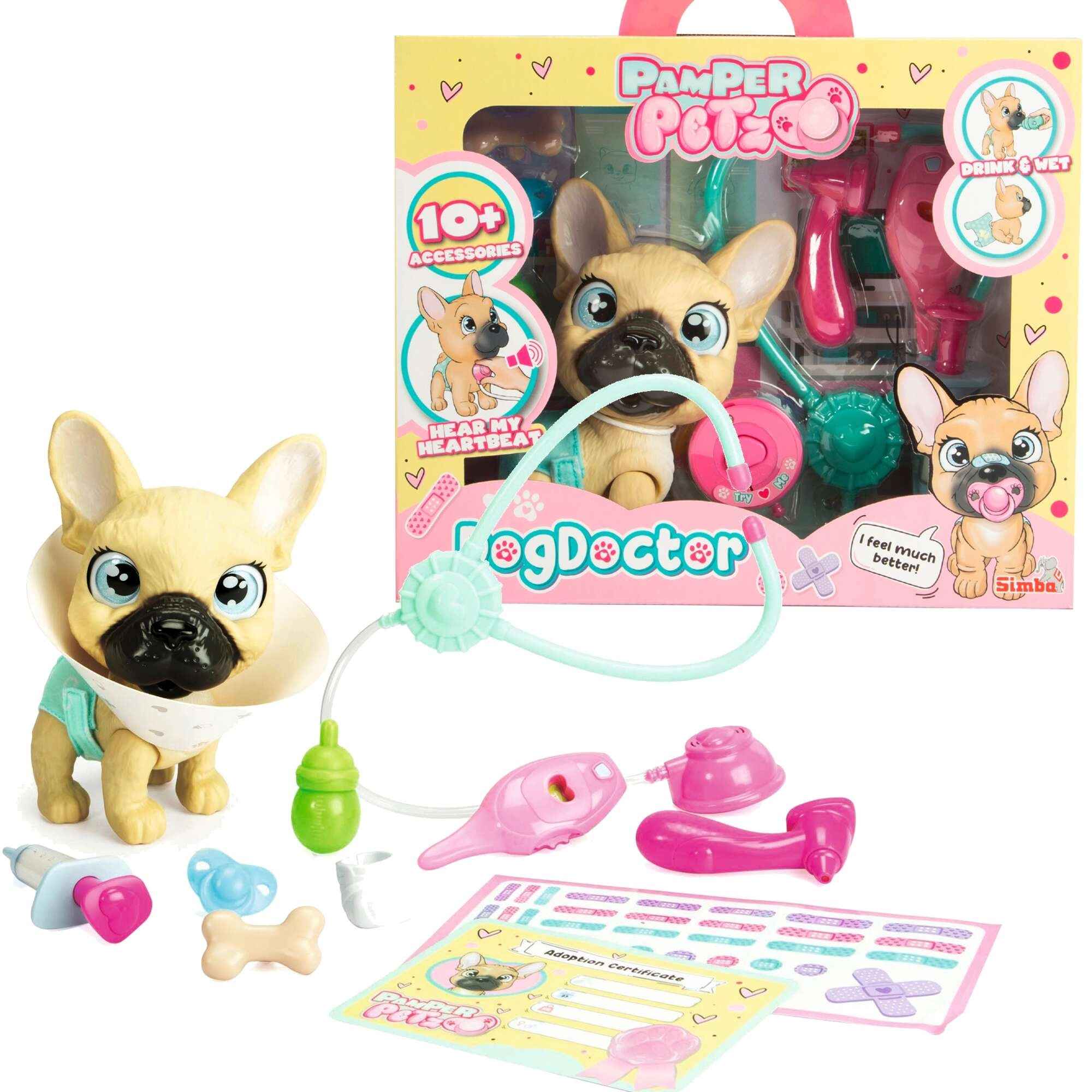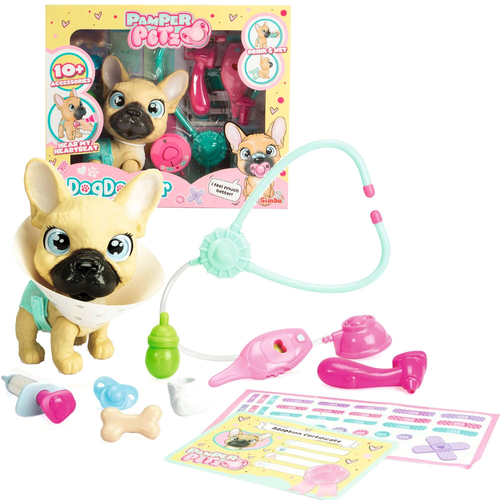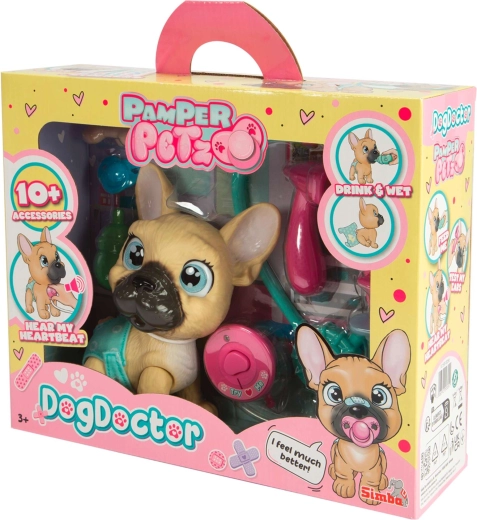 Odkryj uroczego pieska z kolekcji PAMPER PETZ z zestawem weterynaryjnym do realistycznej opieki i zabawy. Francuski buldożek o wysokości 17 cm potrafi pić wodę i siusiać do pieluszki, która po zamoczeniu zmienia kolor na żółty. Czeka na swojego małego opiekuna z ponad 10 akcesoriami, w tym stetoskopem z dźwiękiem, a także oferuje magiczną łapkę, która po przetarciu wodą zdradza płeć pupila.