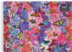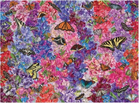Detaliczną ilustrację motyli w kwietnej scenerii z bogatą paletą różowych, lawendowych i niebieskich tonów miło się ogląda i zachęca do układania.