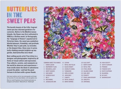 Zanurz się w fascynującej kwiatowej kompozycji z 37 odmianami groszków oraz starannie rozmieszczonymi motylami autorstwa projektanta i fotografa Troya Littena. Te puzzle GALISON 1000 elementów wyróżniają się nasyconymi kolorami, wysoką jakością druku i motywem, który zachwyci miłośników natury i doświadczonych układaczy.