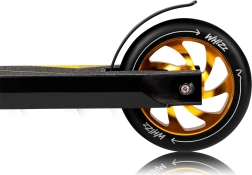 Dzięki systemowi kompresji HIC połączenie widelca i obejmy jest wyjątkowo mocne i niezawodne. Koła z poliuretanu w połączeniu z łożyskami ABEC-9 zapewniają płynną i szybką jazdę, a tylni hamulec i antypoślizgowa deska zwiększają bezpieczeństwo. Średnica 110 mm idealnie równoważy prędkość i zwrotność.