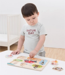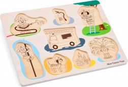 Układanka zawiera osiem elementów, z których każdy ma własny otwór i uchwyt dla łatwego chwytu. Pod każdym elementem znajduje się obrazek, który pomaga dzieciom znaleźć właściwe miejsce.
