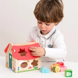 Ten domek do sortowania kształtów to idealna zabawka dla dzieci od 12 miesięcy. Zestaw zawiera osiem różnych kształtów, których dzieci uczą się rozpoznawać i wkładać do odpowiednich otworów. Po ukończeniu zadania mogą łatwo wyjąć kształty, otwierając dach.