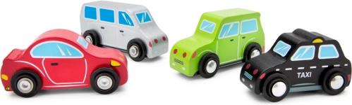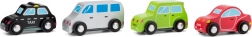 Ten zestaw oferuje cztery drewniane samochodziki o prostym i kolorowym wyglądzie, przyciągającym uwagę najmłodszych. Samochodziki są lekkie i łatwe do chwytania, co czyni je idealnymi do rozwijania motoryki małej. Dzieci mogą używać ich do kreatywnej i pomysłowej zabawy, co jednocześnie pomaga rozwijać umiejętności wyrażania się.