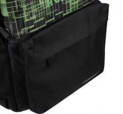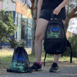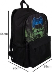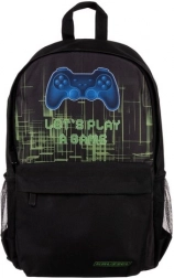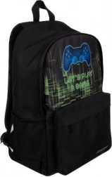 Wnętrze oferuje pojemną komorę główną z wyściełaną kieszenią na laptopa, przednią kieszeń z ukrytym zamkiem na drobiazgi oraz dwie boczne kieszenie z siatki na butelkę lub parasol. Nowoczesna gamingowa grafika z kontrolerem nadaje plecakowi oryginalny wygląd, który spodoba się wszystkim fanom gamingu.