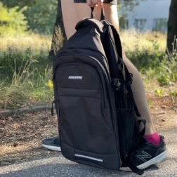 Plecak o dużej pojemności 45 l z mocnej tkaniny Oxford 600D odpornej na zużycie mechaniczne i niesprzyjające warunki pogodowe. Wnętrze podszyte materiałem Oxford 210D, a plecy na całej powierzchni wypełnione pianką EPE dla większego komfortu i ochrony zawartości przed uderzeniami. Nie brakuje odblaskowego paska dla lepszej widoczności.