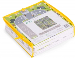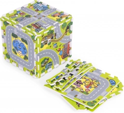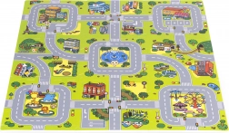 Złożona mata tworzy przestronne miasteczko z drogami i parkami. Idealna do jeżdżenia autkami, budowania scenek i nauki przepisów ruchu drogowego poprzez zabawę.