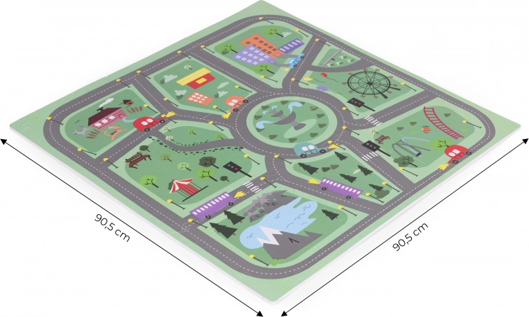 Ta wysokiej jakości piankowa mata z detalicznym motywem miasta oferuje dzieciom nieskończone możliwości zabawy: drogi, ulice i skrzyżowania zapraszają do jazdy autkami i wymyślania własnych historii. Dzięki grubości 1 cm powierzchnia jest przyjemnie miękka, tłumi uderzenia i jednocześnie izoluje od zimnej podłogi. Mata wykonana jest z certyfikowanej pianki EVA, która jest lekka, wytrzymała i przyjazna dla delikatnej skóry dziecka.