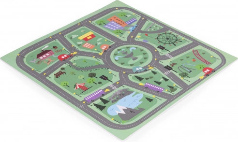 Szczegółowy motyw dróg, skrzyżowań i elementów miejskich inspiruje dzieci do wymyślania historii, zabawy autkami oraz rozwijania wyobraźni i motoryki małej.