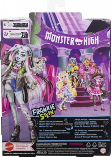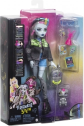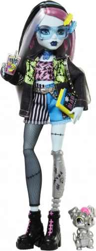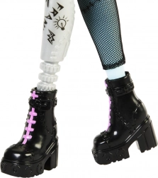 Poznaj ikoniczną uczennicę MONSTER HIGH – Frankie Stein. Ta lalka wyróżnia się imponującym miksem stylu punk i techno: dżinsowa kurtka, szorty, wyraziste kolczyki w kształcie błyskawic oraz czarne botki z różowym sznurowaniem. Dzięki stawom do ustawiania póz łatwo stworzysz efektowne sceny i opowieści.