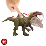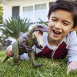 Pokrętło uruchamia dynamiczne ruchy i dźwięki: po przesunięciu do przodu głowa atakuje w dół z efektem gryzienia i warkotem, po obróceniu do tyłu głowa cofa się z rykiem i aktywuje się tryb „gotowy do bitwy” z rozszerzonymi kolcami ogona. Ukryty kod umożliwia połączenie z aplikacją Jurassic World, gdzie odblokujesz cyfrową wersję dinozaura oraz dodatkowe treści interaktywne.