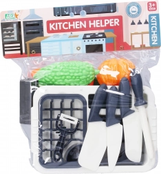 Odkryj radość w kuchni z tym uroczym dziecięcym zestawem kuchennym! Ten zestaw obejmuje nie tylko zlew i suszarkę do naczyń dla realistycznej zabawy, ale także różne narzędzia kuchenne takie jak trzy noże, ostrzałka do noży i deska do krojenia. Zestaw dodatkowo zawiera obieraczkę i kilka elementów żywności jak krojoną marchewkę, kukurydzę i dynię, które umożliwiają realistyczną zabawę.