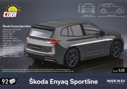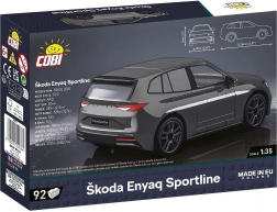 Zestaw konstrukcyjny Skoda Enyaq Sportline to pomniejszony model w skali 1:35, który wiernie odwzorowuje charakterystyczne kształty oryginalnego pojazdu Škoda Enyaq iV. Posiada obrotowe koła z oponami, które są idealne do ruchu podczas zabawy. Ten model ucieszy nie tylko dzieci, ale i dorosłych fanów zestawów konstrukcyjnych, kolekcjonerów oraz miłośników motoryzacji.