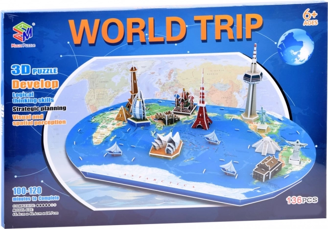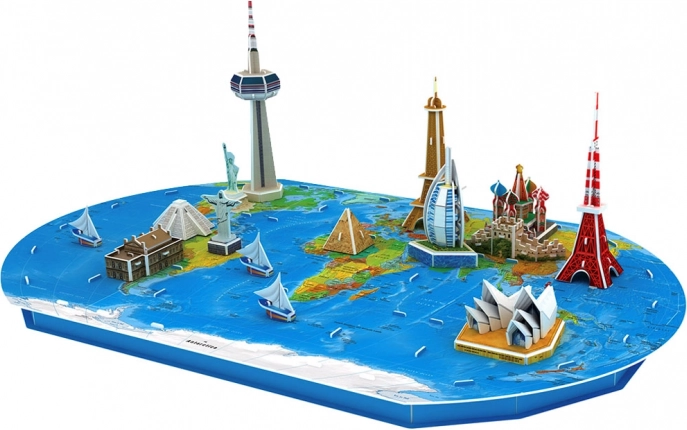 Trójwymiarowa mapa świata z wypukłymi zabytkami naturalnie skłania dzieci do odkrywania kontynentów, oceanów i najsłynniejszych budowli świata.