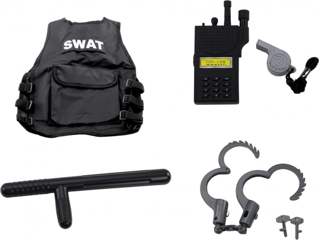 - Realistyczne akcesoria: kamizelka, pałka, kajdanki, gwizdek, krótkofalówka