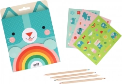 - Pełne wyposażenie – szkicownik, kredki i naklejki w jednym