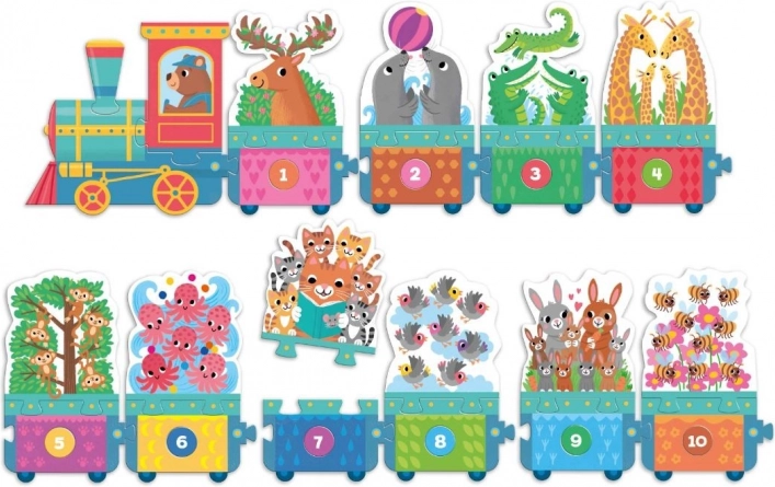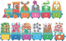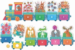 Czas ruszać! Za chwilę odjeżdżamy! Pora dołączyć ostatnie wagony. Ile małpek dziś wieziemy? Jedzie z nami też słoń? Który wagon wiezie najwięcej zwierzątek?