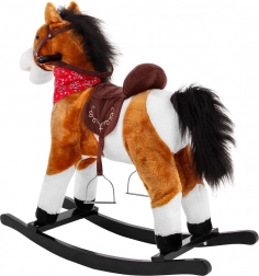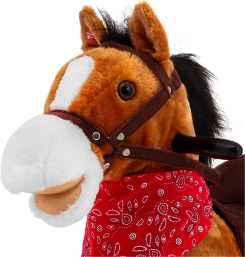 Uroczy bujany konik z miękkiego pluszu zachwyci każde dziecko od 3 lat. Ma stabilne drewniane płozy, wygodne siodło ze strzemionami i uzdę. Na uszach znajdują się czujniki, które uruchamiają odgłosy rżenia i galopu oraz kowbojską piosenkę, a jednocześnie konikowi porusza się pyszczek i ogon. Świetne połączenie bezpiecznej zabawy i rozwoju motoryki.