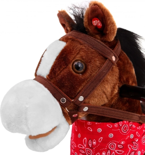Ten pluszowy koń na biegunach w ciemnobrązowym kolorze ucieszy każdego małego kowboja i kowbojkę. Jest miękki, wygodny i wyposażony w realistyczne detale – siodełko ze strzemionami, lejce oraz chustkę na szyi. Czujniki w uszach aktywują dźwięki rżenia i galopu lub wesołą kowbojską piosenkę, a koń jednocześnie porusza pyskiem i ogonem.