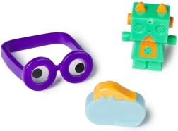 Zawiera kolorowe plastikowe zabawki, w tym okulary z oczkami googly i figurki robota.
