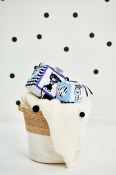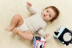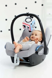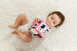 Wysoki kontrast czarno-białych motywów z kolorowymi detalami stymuluje wzrok i utrzymuje uwagę maluszka podczas zabawy.