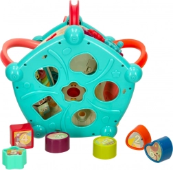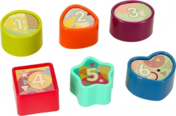Sześć kolorowych klocków i odpowiadające im otwory uczą dzieci rozpoznawania kształtów, kolorów i liczb. Wspiera myślenie logiczne i orientację przestrzenną.