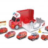 Ten fantastyczny zestaw zawiera duży wóz strażacki o długości 34 cm oraz sześć małych aut o wielkości 7–8 cm, co jest idealne do rozwijania dziecięcej wyobraźni i kreatywnej zabawy. Wóz strażacki wyposażony jest w swobodnie toczące się koła, co umożliwia płynne poruszanie się po każdej powierzchni.
