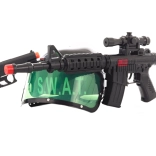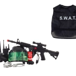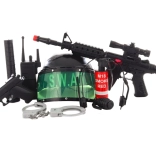 Policyjny zestaw zawiera hełm, kamizelkę, karabin maszynowy, krótkofalówkę, pistolet, pałkę, kajdanki, słuchawki i granat. Materiał: plastik. Zapakowane w przezroczyste plastikowe opakowanie. Wymiary opakowania ok. 52×34×12 cm. Rozmiar kamizelki 34×37 cm. Wiek 3+