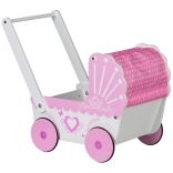 Drewniany wózek dla lalek ECOTOYS łączy bezpieczeństwo, stabilność i bajkowy wygląd. Delikatne różowe serduszka, łukowata budka i zgrabne linie dodają uroku dziecięcemu pokojowi, a jednocześnie wspierają wyobraźnię i umiejętności społeczne podczas zabawy w opiekę.