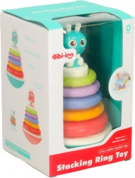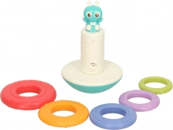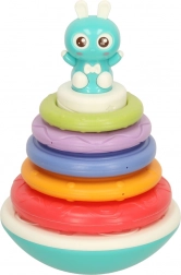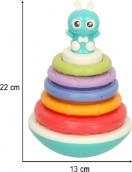 Ta kolorowa wieża ucieszy każde dziecko! Składa się z kołyszącej się podstawy z małym przyjacielem – króliczkiem – oraz pięciu pierścieni o różnej wielkości. Zadaniem dziecka jest nakładać je po kolei, tworząc tęczową wieżę. Po każdym nałożeniu pierścienia rozbrzmiewa wesoła melodia, która zachęca do dalszej zabawy.