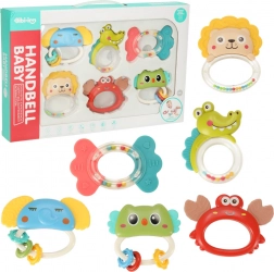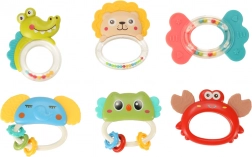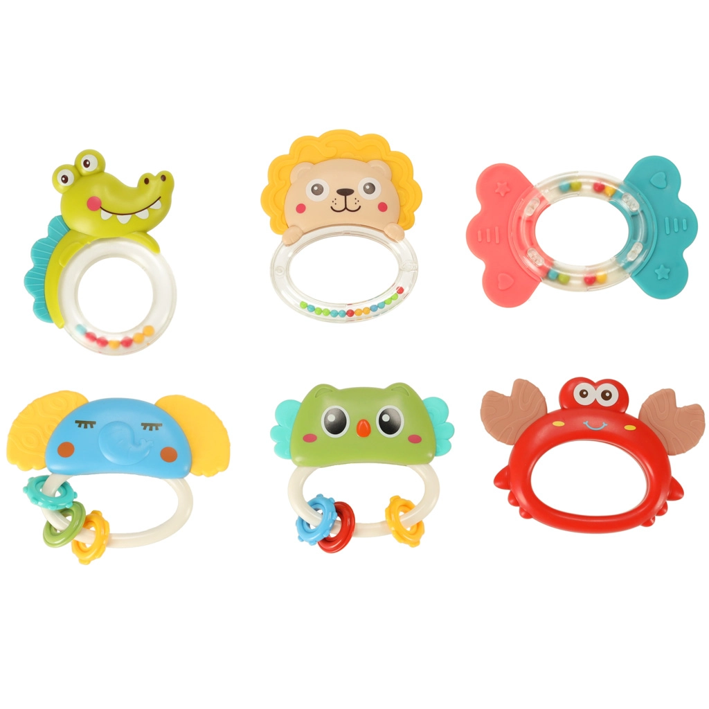 Kolorowy zestaw 6 grzechotek i gryzaków dla najmłodszych łączy zabawę i ulgę podczas ząbkowania. Każdy element jest inny, z rozmaitymi kształtami i zwierzątkami, które wspierają rozwój zmysłów. Wykonane z wysokiej jakości materiałów ABS i TPE, bezpiecznych dla dzieci. Ulga przy ząbkowaniu, stymulacja sensoryczna, bezpieczne i trwałe wykonanie.