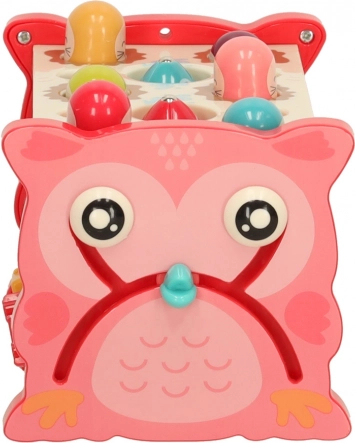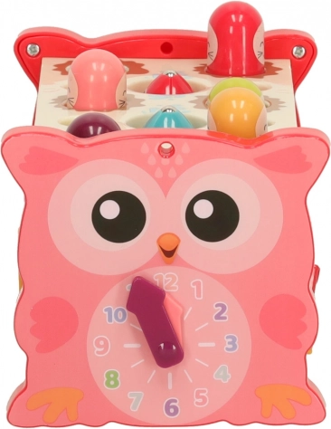 Ta interaktywna różowa edukacyjna zabawka łączy kilka aktywności w jednym kompaktowym boksie. Dzieci mogą młoteczkiem wbijać „krety”, łowić kolorowe rybki i robaczki dołączoną wędką, obracać kolorowe kółka zębate, przesuwać autka w labiryncie oraz poznawać podstawy odczytywania godzin. Żywe kolory i przyjazne ilustracje wspierają stymulację sensoryczną i radość z zabawy.