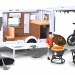 W zestawie znajdują się także ruchome elementy i tematyczne akcesoria – boks dachowy (interpack), deska surfingowa, rower i grill – które rozszerzają możliwości zabawy i wspierają rozwój kreatywności. Pojazd nie ma napędu, co zapewnia bezpieczną i cichą zabawę w domu i na zewnątrz.