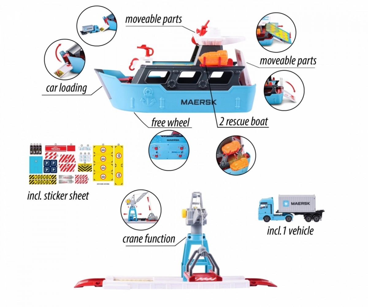 - Realistyczne funkcje i ruchome części – tak jak na prawdziwym statku towarowym, kontenery, a nawet całe auta, są przenoszone na pokład za pomocą ręcznie sterowanego dźwigu. Pojazd ma także składaną rampę załadunkową.