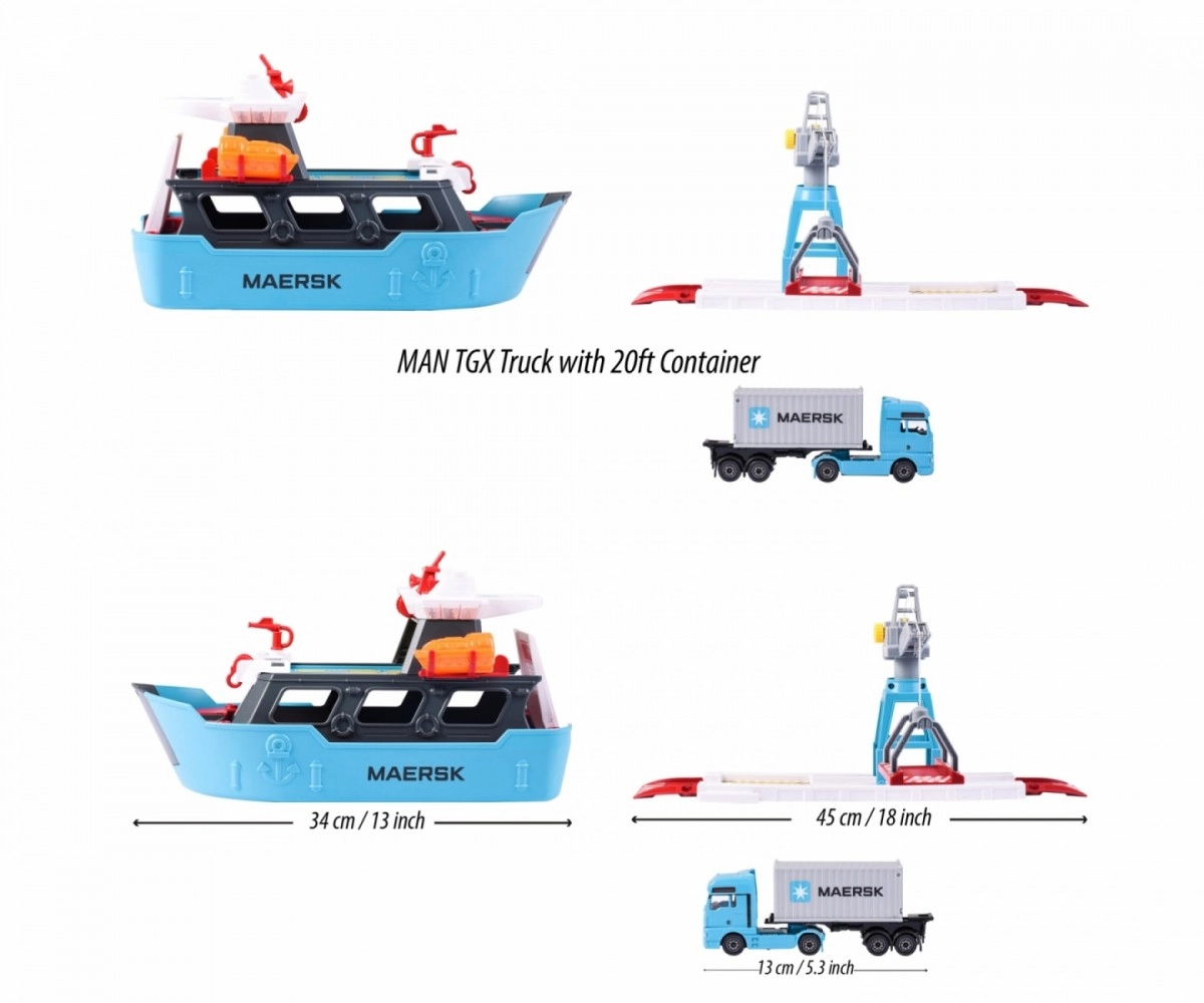 - Licencjonowany port zabawkowy Majorette Creatix z ciężarówką MAN TGX z kontenerem – stacja logistyczna Maersk w mgnieniu oka zamieni pokój dziecka w port przeładunkowy i zajmie dzieci rozładowywaniem ciężarówek oraz transportem towarów ze statku.