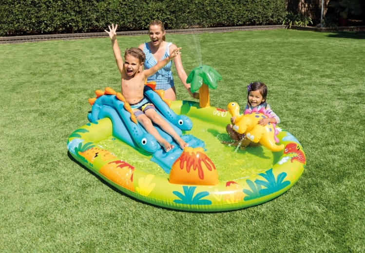 Ten nadmuchiwany basenik z oryginalnym wzorem dinozaura zapewnia mnóstwo zabawy w ogrodzie. Dzieci będą się świetnie bawić, zjeżdżając i bawiąc się figurkami dinozaurów, a wbudowana palma–zraszacz doda kolejny element wodnego orzeźwienia.