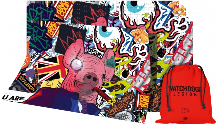 Podejmij wyzwanie układanki z licencjonowanymi puzzlami ze świata WATCH DOGS: LEGION. Motyw z ikoniczną świńską maską oferuje 1000 elementów o imponujących kolorach, precyzyjnym wycięciu i płótnowej powierzchni, która ogranicza odblaski. W zestawie znajdziesz także plakat 1:1 oraz bawełniany woreczek do przechowywania elementów.