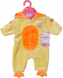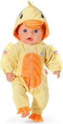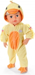 Miękki kaczy kombinezon dla lalek BABY born w rozmiarze 43 cm zamieni zabawę w przytulną przygodę. Kaptur z dziobkiem, kontrastowy pomarańczowy brzuszek i „pływające” stópki dopełniają uroczy wygląd, a przedni zamek ułatwia przebieranie i ćwiczenie małej motoryki.