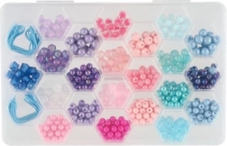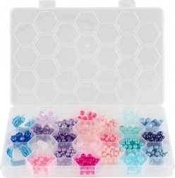 Plastikowe pudełko z sześciokątną pokrywką ułatwia przechowywanie i organizację koralików według kolorów.