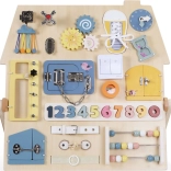 Tablica sensoryczna Domek jest zaprojektowana tak, aby dzieci mogły ćwiczyć wiązanie, łączenie i otwieranie różnych elementów, dzięki czemu przygotowują się do codziennych czynności. Zamki, paski i sznurowadła oferują niezliczone możliwości ćwiczeń. Tablica posiada także cyfry, z którymi można ćwiczyć proste zadania matematyczne. Zawiera stojak, który zapewnia wygodną i niczym niezakłóconą zabawę.