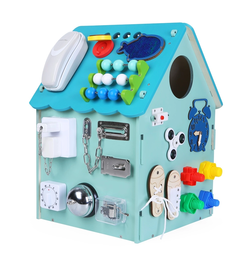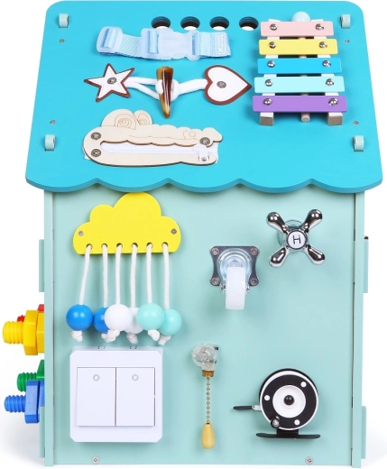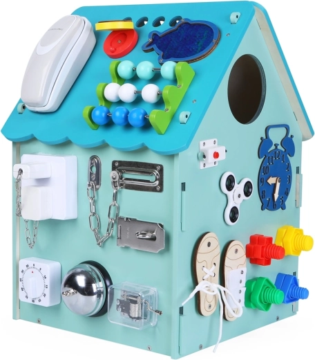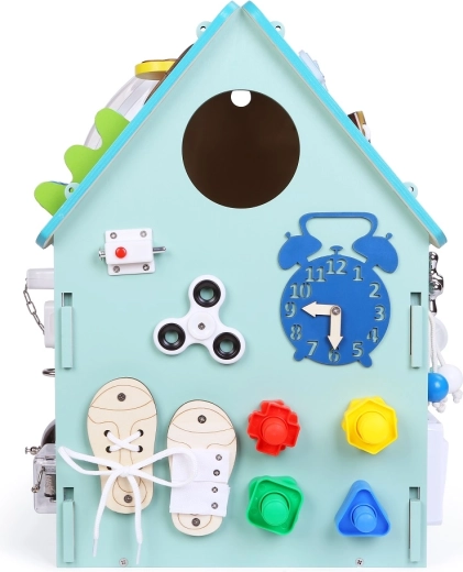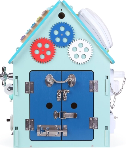 Ten solidny drewniany domek jest pełen funkcjonalnych elementów, które zachęcają dzieci do odkrywania. Od dzwonka, przez telefon, po różne zamki i klamry – każdy detal wspiera samodzielność i praktyczne umiejętności poprzez zabawę. Kolorystyka może się nieznacznie różnić w kierunku turkusowych odcieni.