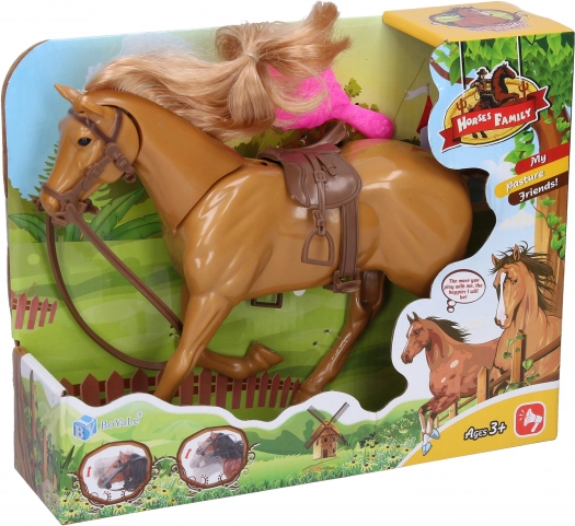 Uroczy koń-zabawka o wysokości 26 cm ucieszy każdego małego miłośnika koni. Oferuje efekty dźwiękowe po pochyleniu głowy, w zestawie znajduje się grzebień do czesania grzywy oraz baterie w opakowaniu. Dostępny w dwóch wariantach kolorystycznych – ciemnobrązowym i jasnobrązowym.