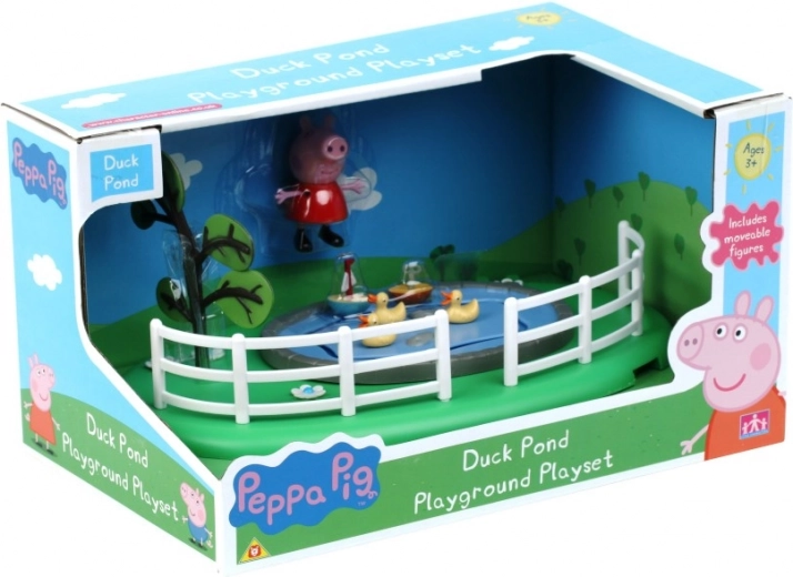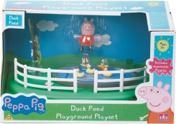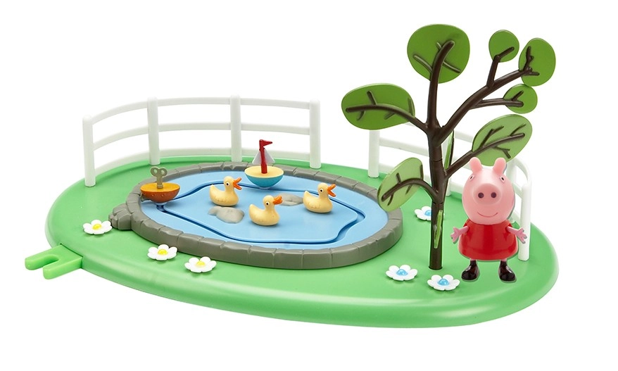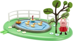 Scenka z niebieską taflą wody, płotkiem i drzewem. Dzieci mogą ustawiać figurki wokół stawiku i tworzyć opowieści z Peppą nad wodą.