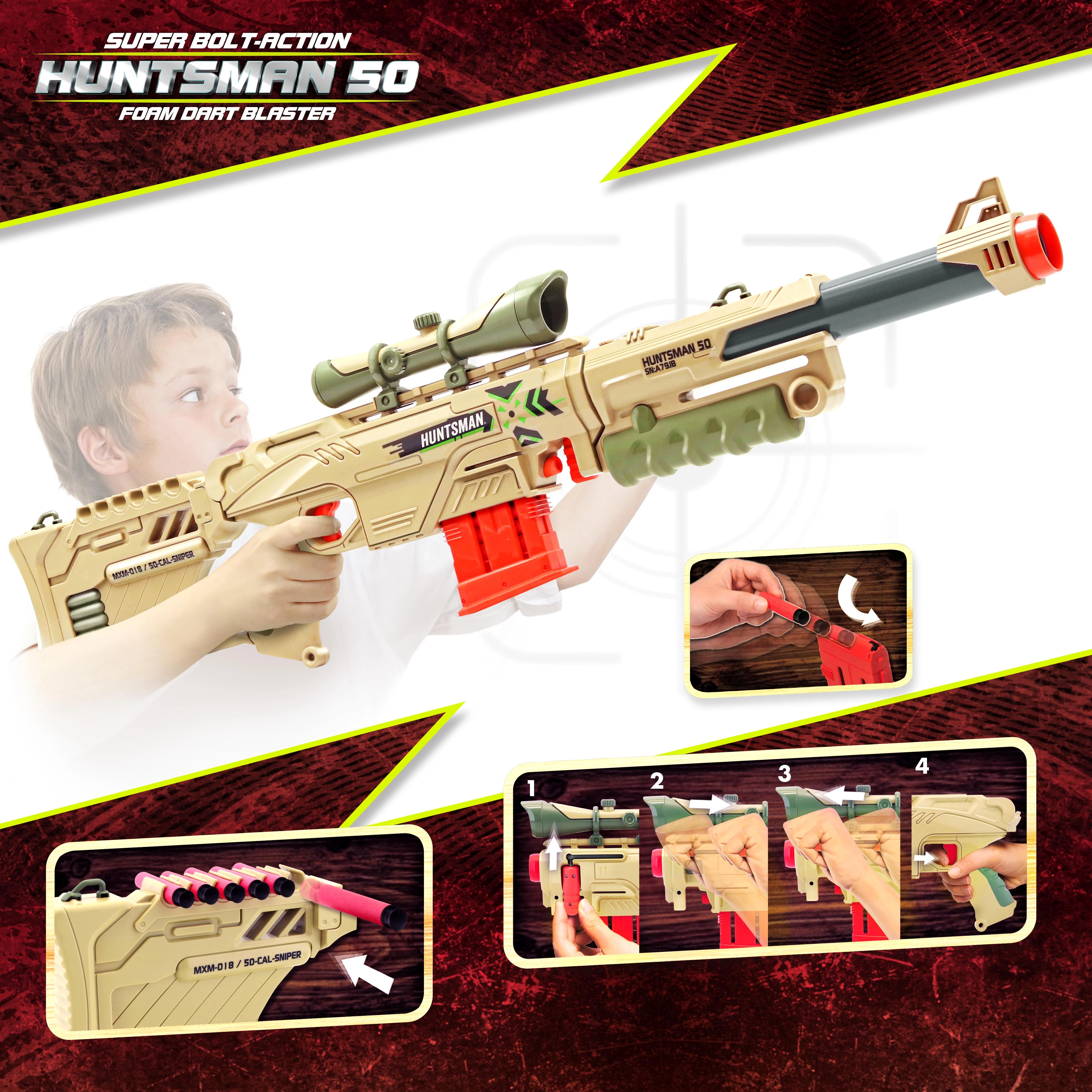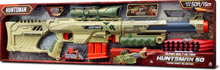 Ciesz się dynamiczną zabawą z największą bronią z kolekcji Huntsman – Sniper Blaster 92 cm. Łatwo zdejmij przedłużenie lufy, kolbę i celownik, a długą strzelbę snajperską zmień w poręczny blaster ręczny. W zestawie znajduje się 12 piankowych nabojów, a zabawka jest odpowiednia dla dzieci od 6 lat.