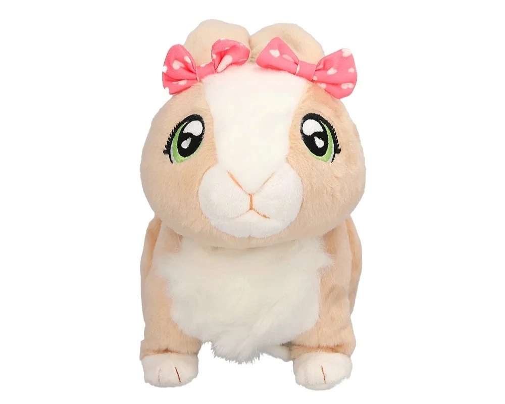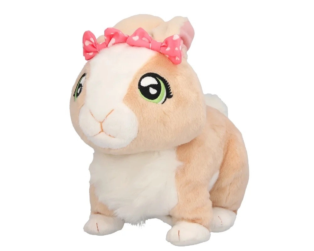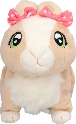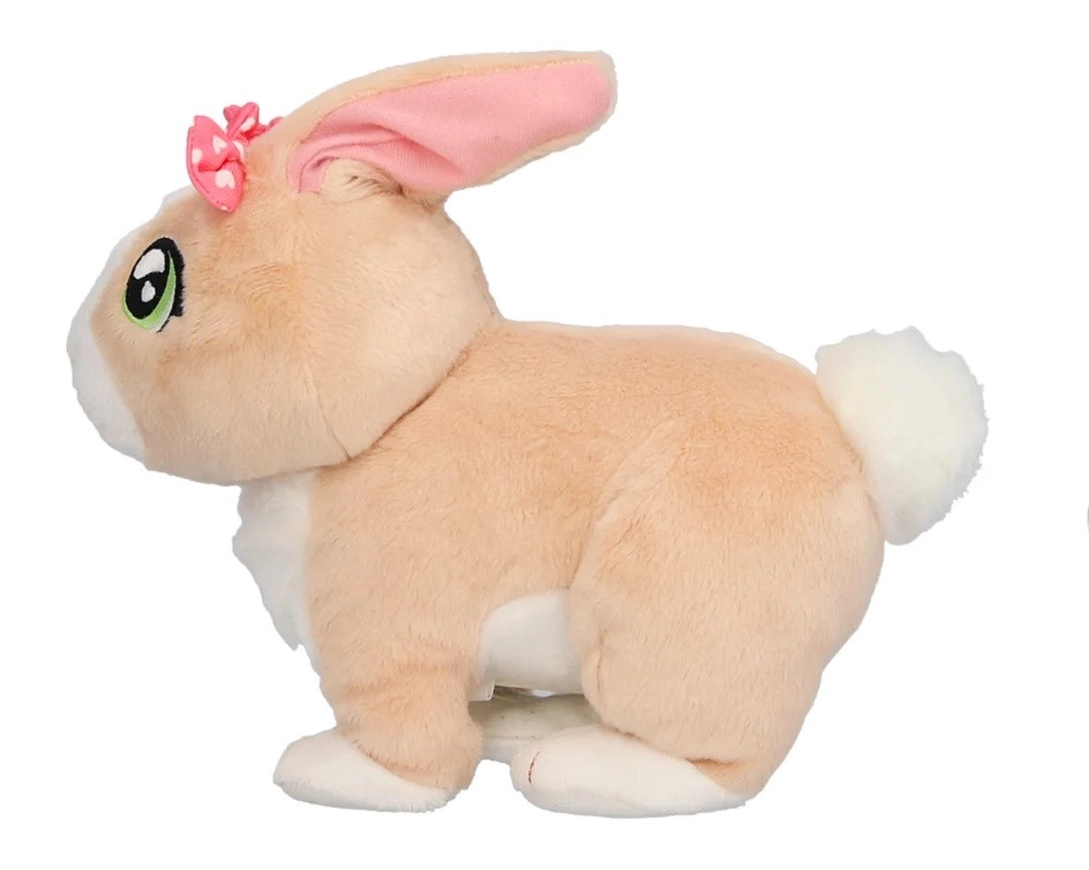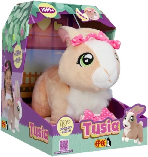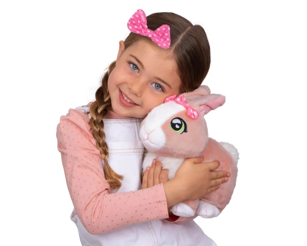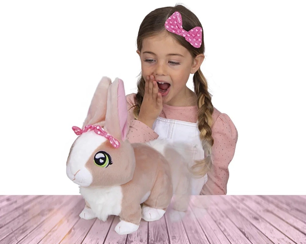 Króliczek Tusia od razu zachwyca mięciutkim beżowym futerkiem, dużymi zielonymi oczami i delikatnymi detalami, w tym różową kokardką. Dzięki funkcjom interaktywnym dostarczy dzieciom mnóstwo zabawy i kojącego przytulania. Po pogłaskaniu radośnie podskakuje, porusza uszkami i wydaje miłe dźwięki, które wspierają wyobraźnię oraz rozwój emocjonalny dziecka.