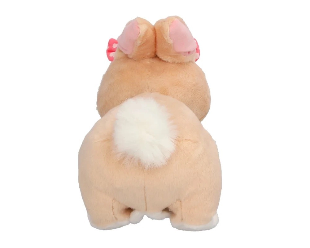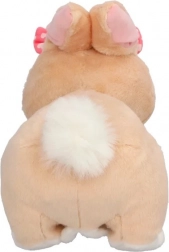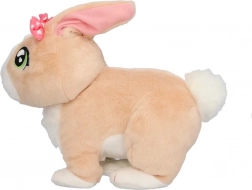 Mięciutkie beżowe futerko, duże zielone oczy i różowa kokardka sprawiają, że króliczek jest idealnym towarzyszem do przytulania i zabawy.