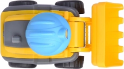 Naciśnięcie kabiny z niebieskim „kaskiem” aktywuje podnoszenie łyżki i jednocześnie rozlega się zabawny gwizd/klakson, który wspiera rozumienie przyczyny i skutku. Buldożer świetnie sprawdza się w swobodnej zabawie na dywanie oraz w piaskownicy, gdzie wytrzymała łyżka poradzi sobie z przenoszeniem piasku i drobnych przedmiotów.