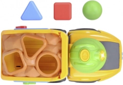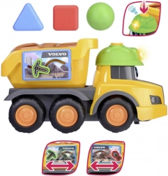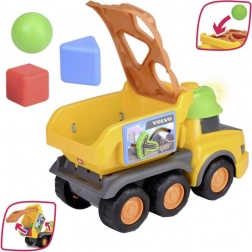Żółta ciężarówka Volvo z wesołym designem i kolorowymi klockami do sortera kształtów jest idealna do rozwoju umiejętności motorycznych.