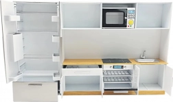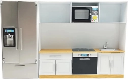 Zawiera wszystko, czego potrzebujesz, aby stworzyć w pełni wyposażoną kuchnię. Maleńkie urządzenia domowe – piekarnik, kuchenka mikrofalowa, lodówka, zamrażarka, a nawet kostkarka do lodu!